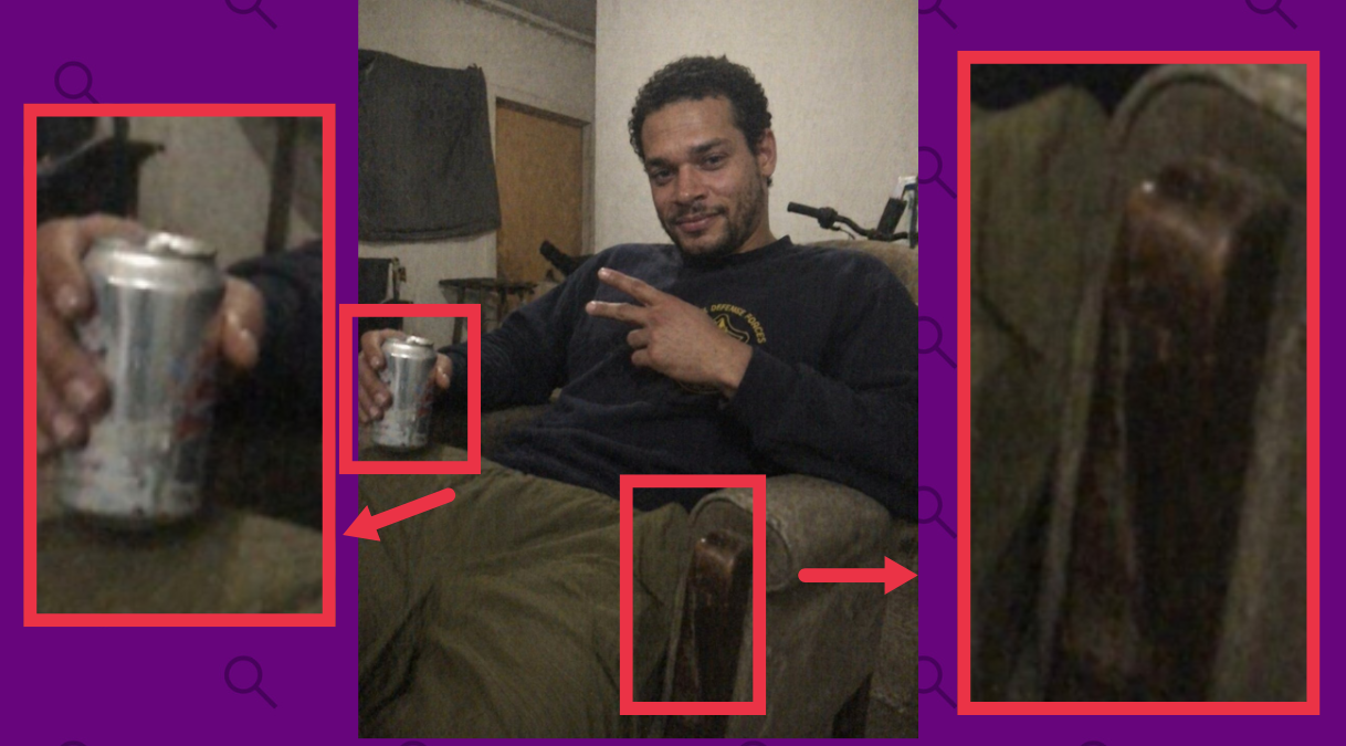Al analizar detalladamente la imagen se observan inconsistencias, como la textura del pantalón fusionada con el sillón y la mano derecha mezclada con la lata.