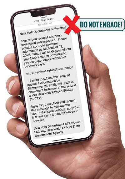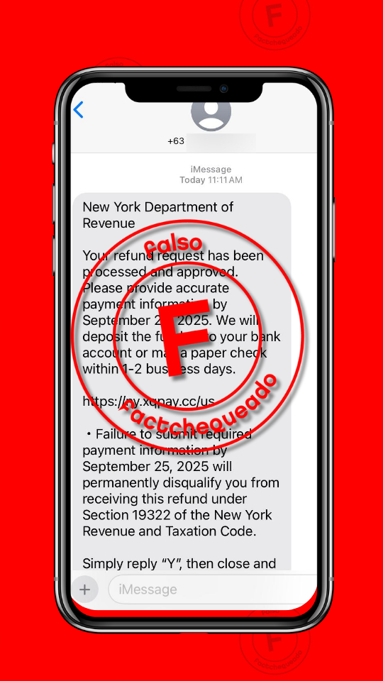 Nuestros aliados de Public Good News nos consultaron sobre un mensaje de texto sobre la supuesta aprobación de un “reembolso” del “New York Department of Revenue”. El mensaje solicita “proveer la información precisa para el 24 de septiembre de 2025” para “depositar los fondos en tu cuenta de banco o enviar un cheque por correo en un plazo de 1 a 2 días hábiles”. Pero eso falso: se trata de un intento de estafa.