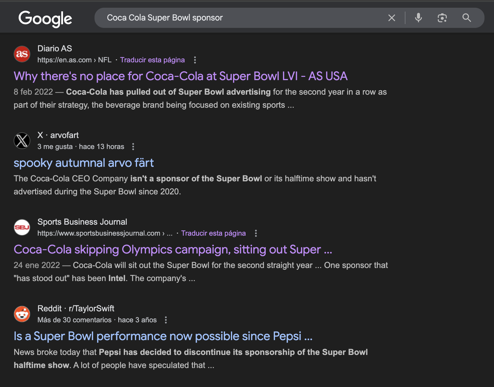 Al buscar “Coca Cola Super Bowl sponsor” en Google, encontramos que las últimas menciones sobre la participación de la compañía en el evento fueron de 2020.