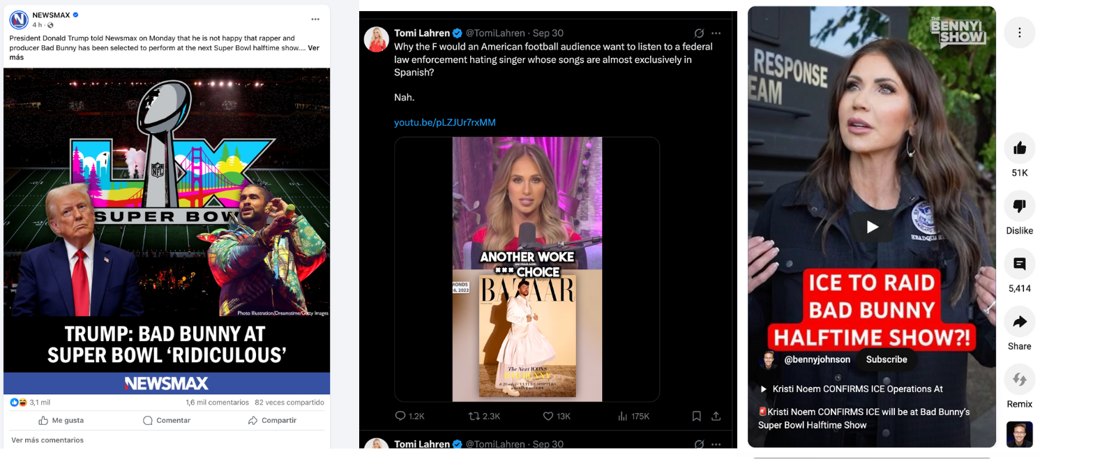 El cantante puertoriqueño Bad Bunny, cuyo nombre real es Benito Antonio Martínez Ocasio, había dicho anteriormente que no haría conciertos en Estados Unidos debido a las redadas de inmgiración que estaban ocurriendo. Cuando la NFL lo escogió como artista principal del show de medio tiempo del Super Bowl LX, generó críticas por parte de figuras conservadoras o republicanas como el presidente Donald Trump; Kristi Noem, secretaria del Departamento de Seguridad Nacional (DHS, por sus siglas en inglés) y el comentarista Benny Johnson, entre otros.