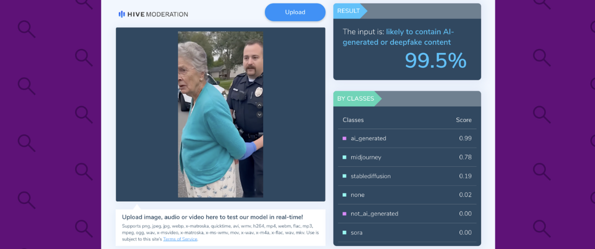 Además, un análisis de una captura de pantalla del video con la herramienta Hive Moderation, detectó que tiene un 99.5% de probabilidades de ser contenido generado por IA.