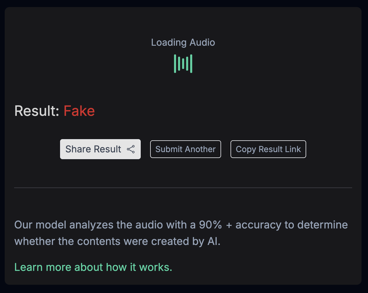 Desde Factchequeado hicimos un análisis del audio de los videos con Resemble AI y Undetectable AI, herramientas de detección de contenido IA. El análisis de Resemble AI lo clasifica como “Fake” (falso, en español) y el de Undetectable AI indica que tiene sólo un 24% de probabilidades de ser real.