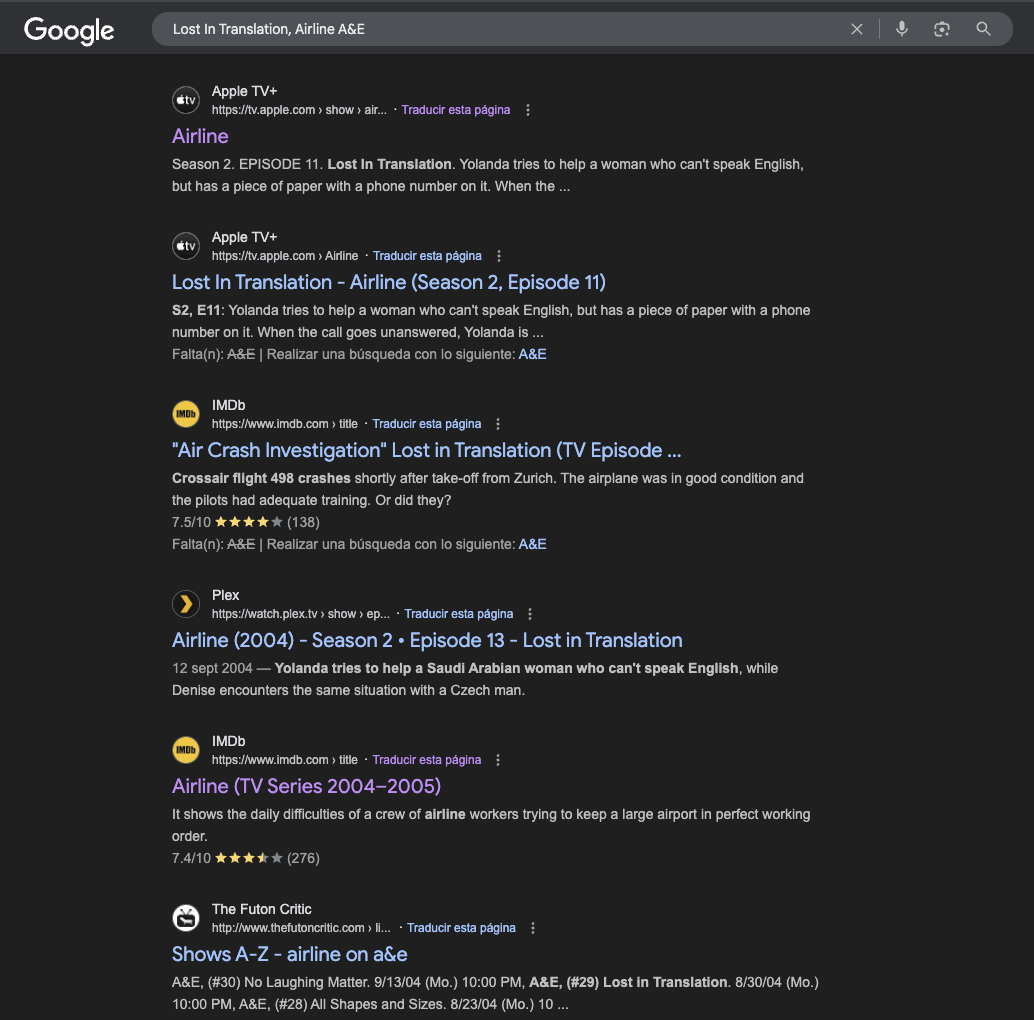 Desde Factchequeado, buscamos “Lost In Translation, Airline A&E” en Google y encontramos que se trata del episodio 11 de la segunda temporada del programa. Una descripción en Apple TV, la plataforma de streaming de Apple, dice en inglés: