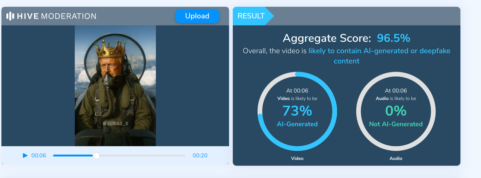 En Factchequeado, además de analizarlo por nuestra cuenta, lo analizamos con una herramienta de detección de contenido generado por IA, que arrojó que el video se hizo con inteligencia artificial.