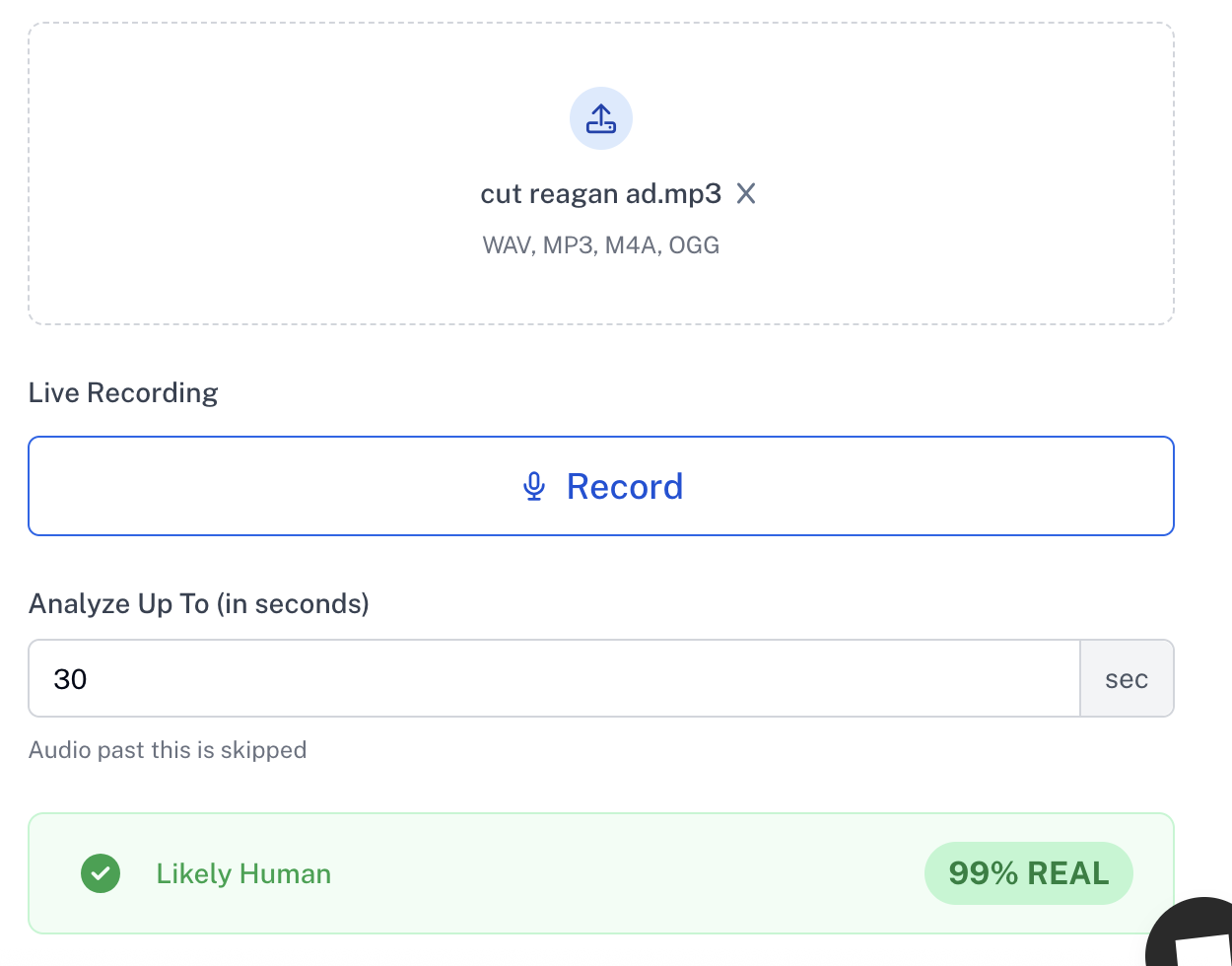 No obstante, a pesar de estas ediciones, el audio no fue generado con IA. En Factchequeado descargamos el audio del video de Ontario, lo subimos a Undetectable AI, herramienta que detecta contenidos generados con IA, y dio como resultado que era 99% probable que la voz fuese humana.