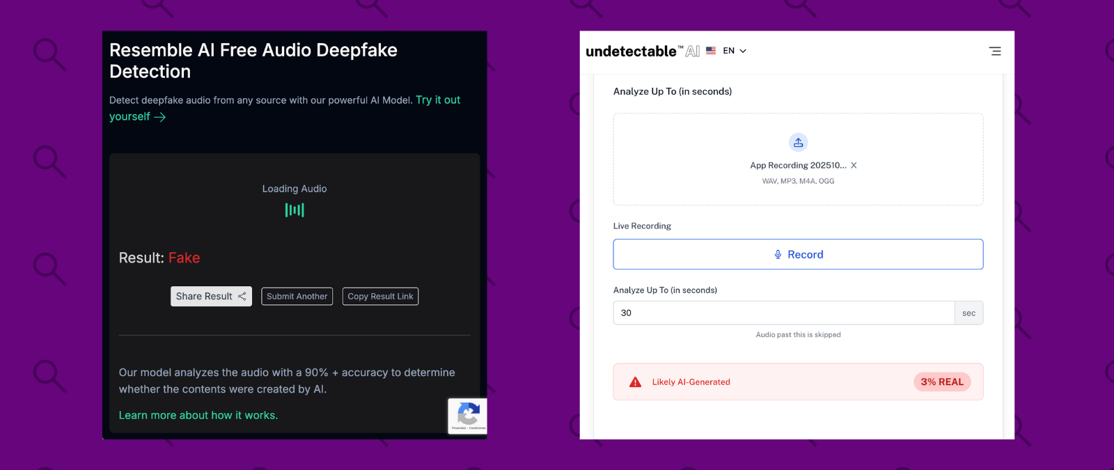 Análisis del audio del video desinformante con las herramientas de detección de audio IA, Resemble AI y Undetectable AI, lo clasificaron como “Fake” (falso, en español) y señalaron que tiene solo un 3% de probabilidades de ser real, respectivamente.