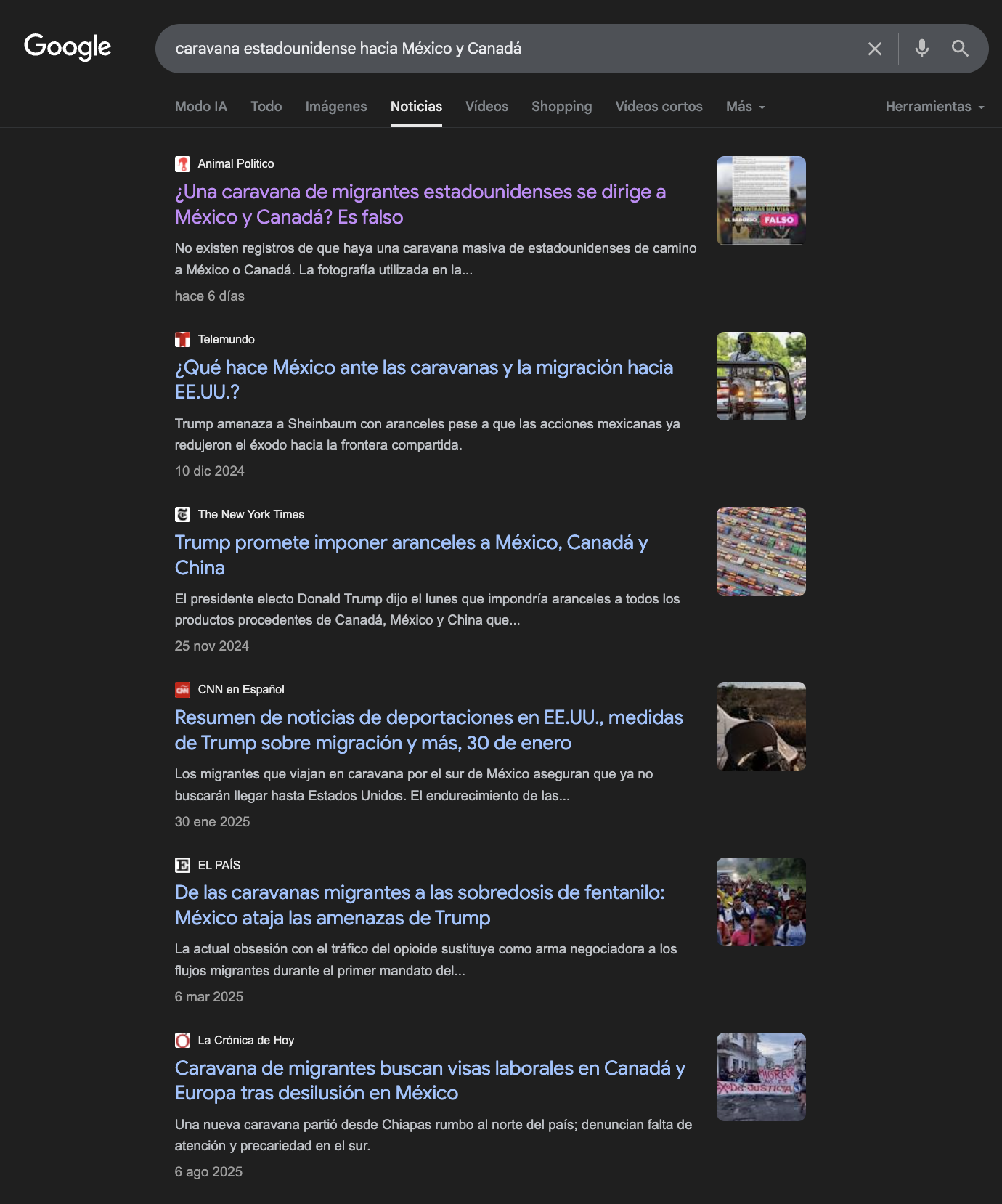 Nuestra búsqueda en Google sobre una “caravana estadounidense hacia México y Canadá” no arrojó resultados que corroboren las afirmaciones sobre la supuesta migración de estadounidenses. Entre los resultados sí encontramos la verificación de Animal Político que desmentía la caravana y un artículo de 2024 de Telemundo sobre las medidas de México ante la migración irregular de ese país hacia Estados Unidos.