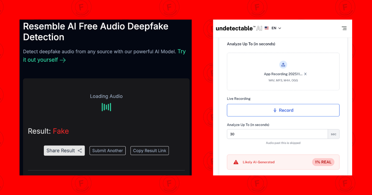 Análisis del audio con herramientas de detección de IA, Resemble AI y Undetectable AI, lo clasificaron como “Fake” (falso, en español) y señalaron que tiene solo 1% de probabilidades de ser real, respectivamente.