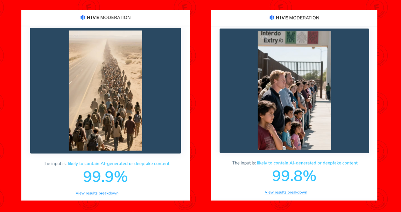 Análisis de dos imágenes sacadas de la publicación desinformante con la herramienta Hive Moderation indican que hay un 99.9% y 99.8% de posibilidades de que el contenido haya sido creado con IA.