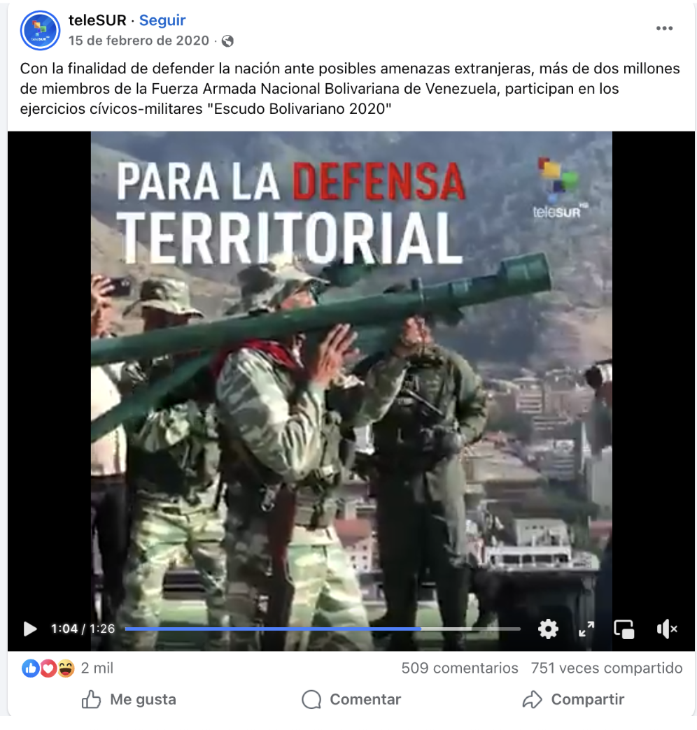Con una búsqueda inversa de imágenes encontramos la publicación original en Facebook del 15 de febrero de 2020, publicada por TeleSur: el video corresponde a los ejercicios militares "Escudo Bolivariano 2020", una campaña a gran escala anunciada y difundida ampliamente en ese momento por el gobierno venezolano.
