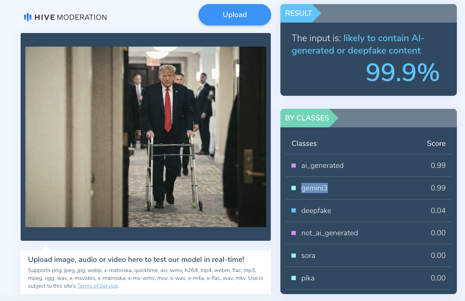 Para confirmar nuestras sospechas, utilizamos Hive Moderation, herramienta que permite detectar qué tan probable es que un contenido hubiese sido generado con IA.