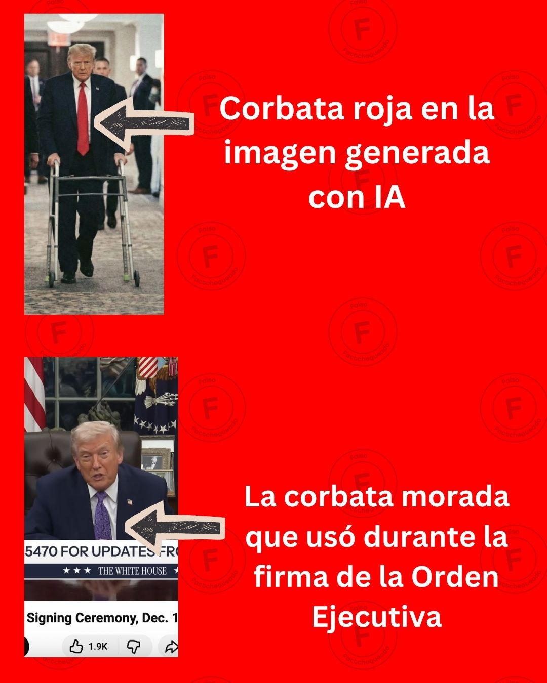 Trump, el 11 de diciembre de 2025, firmó una orden ejecutiva donde afirma que su gobierno retirará fondos federales de ciertos programas a estados que implementen regulaciones “excesivas” a las compañías de IA. La corbata que usó Trump ese día fue morada, mientras que la corbata que aparece en la imagen viral creada con IA es roja.