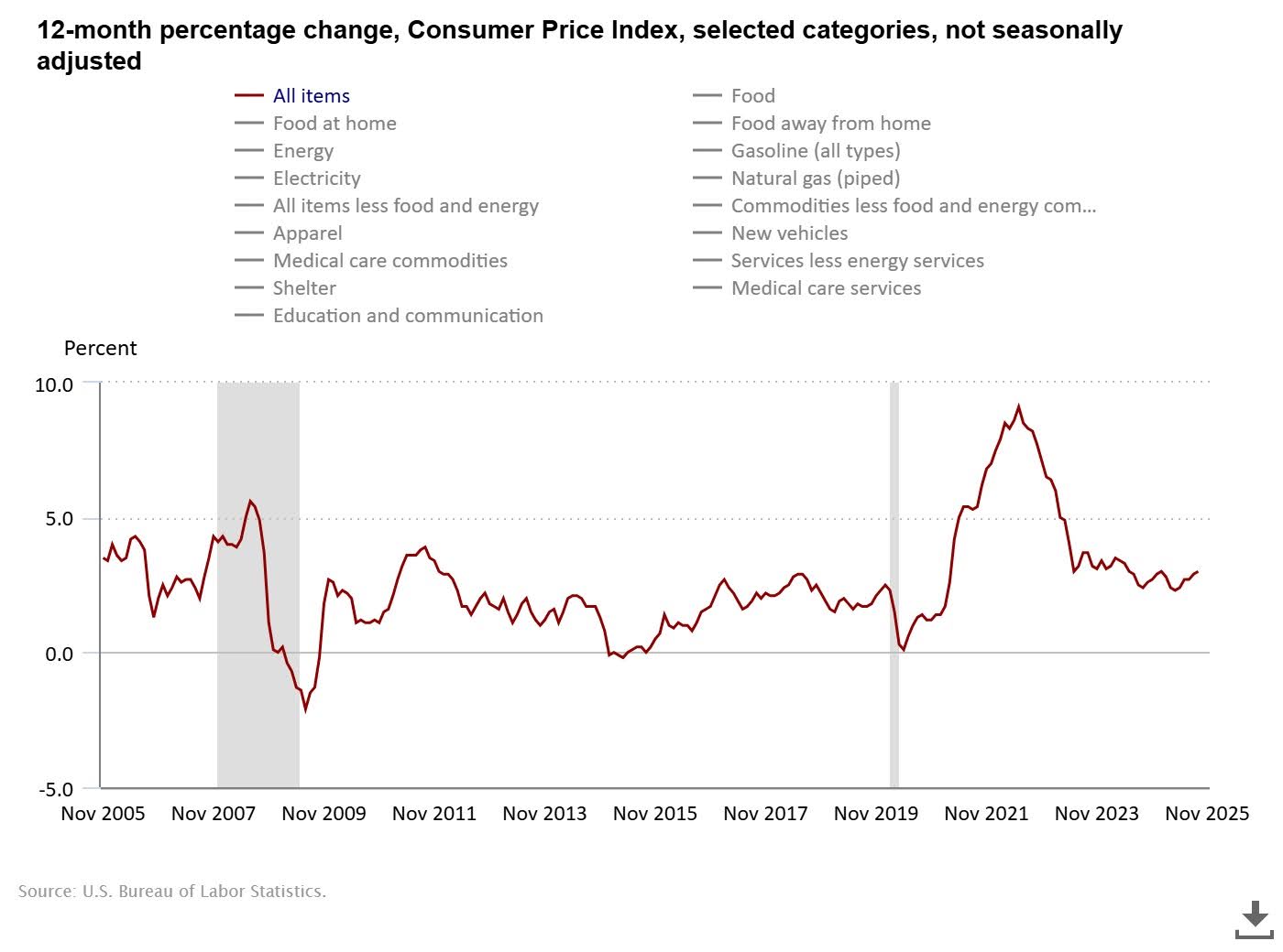 En enero de 2025, cuando Trump tomó posesión de la Presidencia por segunda vez, la inflación se situaba en el 3%, según la Oficina de Estadísticas Laborales. Tres años antes, en junio de 2022, había alcanzado un 9.1% –el máximo en 41 años–, pero desde entonces había empezado a bajar, como muestra este gráfico: