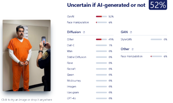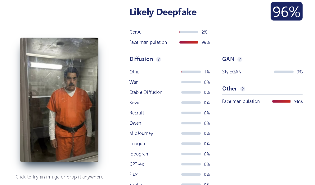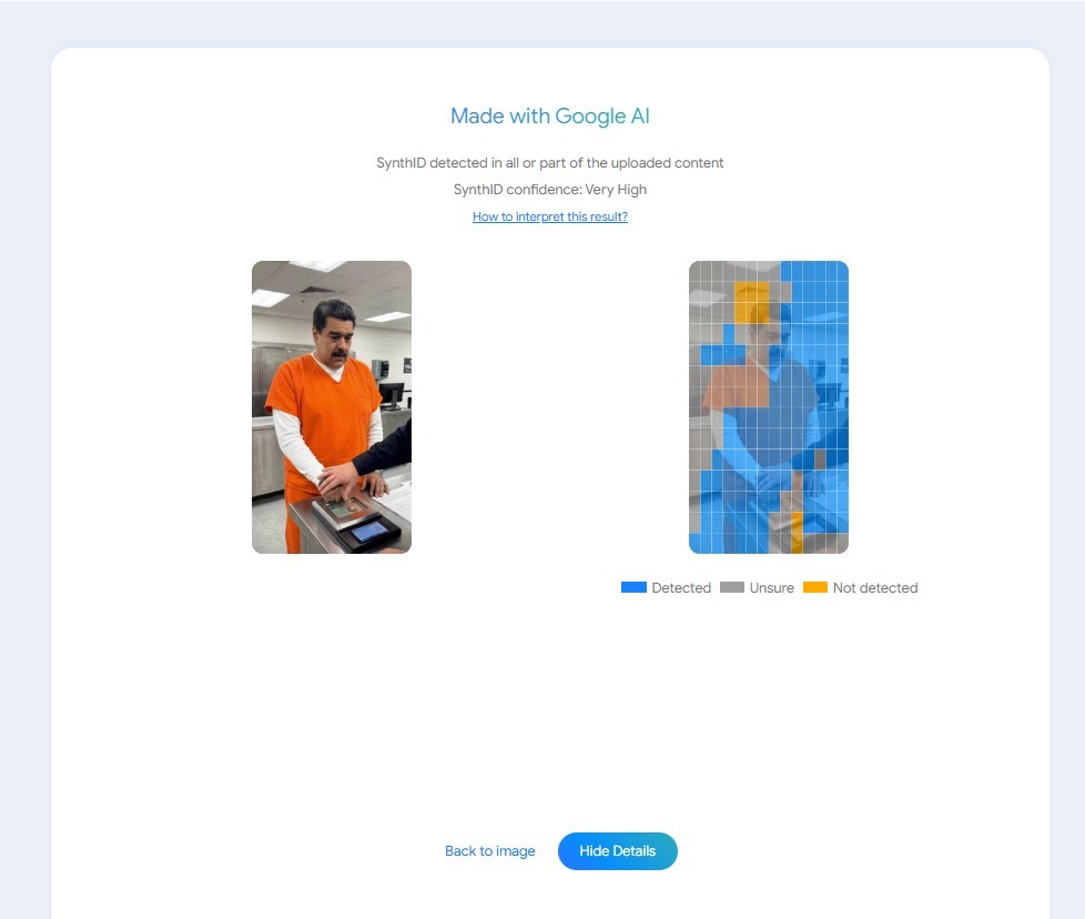 Del trío de imágenes, dos de ellas fueron fácilmente detectadas como generadas sintéticamente, mientras la tercera (en la que se ve a Maduro frente a una escala para medir su altura y siendo fotografiado) no mostró evidencia concluyente definitiva, por lo que fue contrastada con otros elementos.