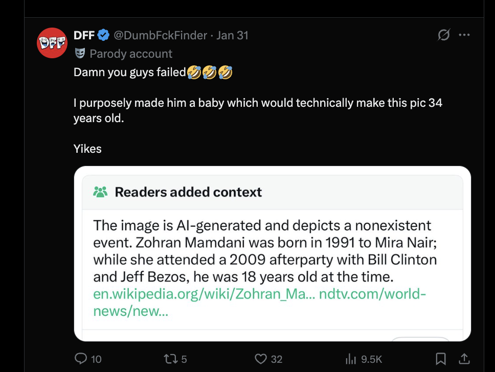 En la imagen donde Mamdani se ve como un bebé, la cuenta responde a una nota de la comunidad, que lo desmiente, diciendo: “Lo hice a propósito como un bebé, lo que técnicamente haría que esta foto tuviera 34 años”.