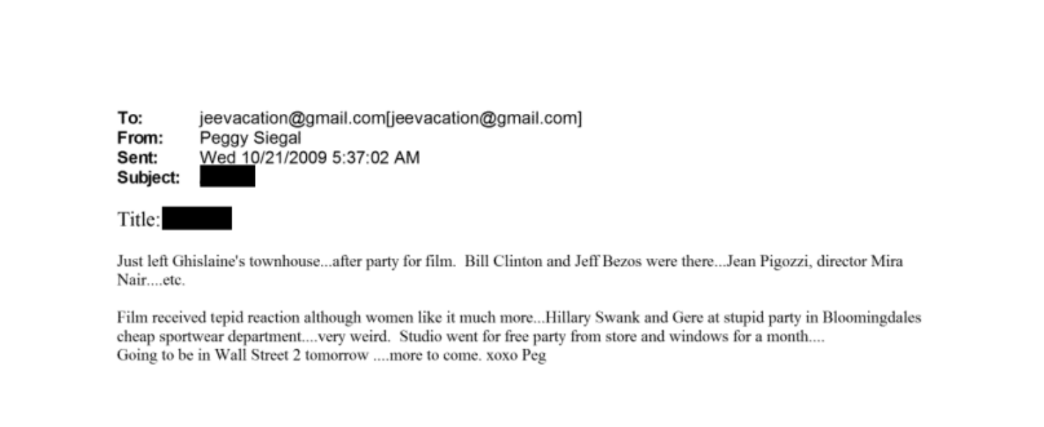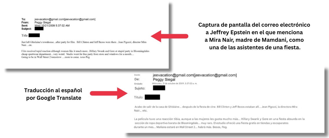 Nair, la mamá de Mamdani, fue mencionada en un correo electrónico enviado a Epstein en el que se asegura que asistió a un evento en 2009 donde también estuvieron presentes Clinton y Bezos. El mensaje fue enviado por la expublicista de Epstein, Peggy Siegal, pero no incrimina a Nair en ninguna conducta inapropiada y fue dirigido a una cuenta de Gmail que el millonario abrió alrededor de 2009.