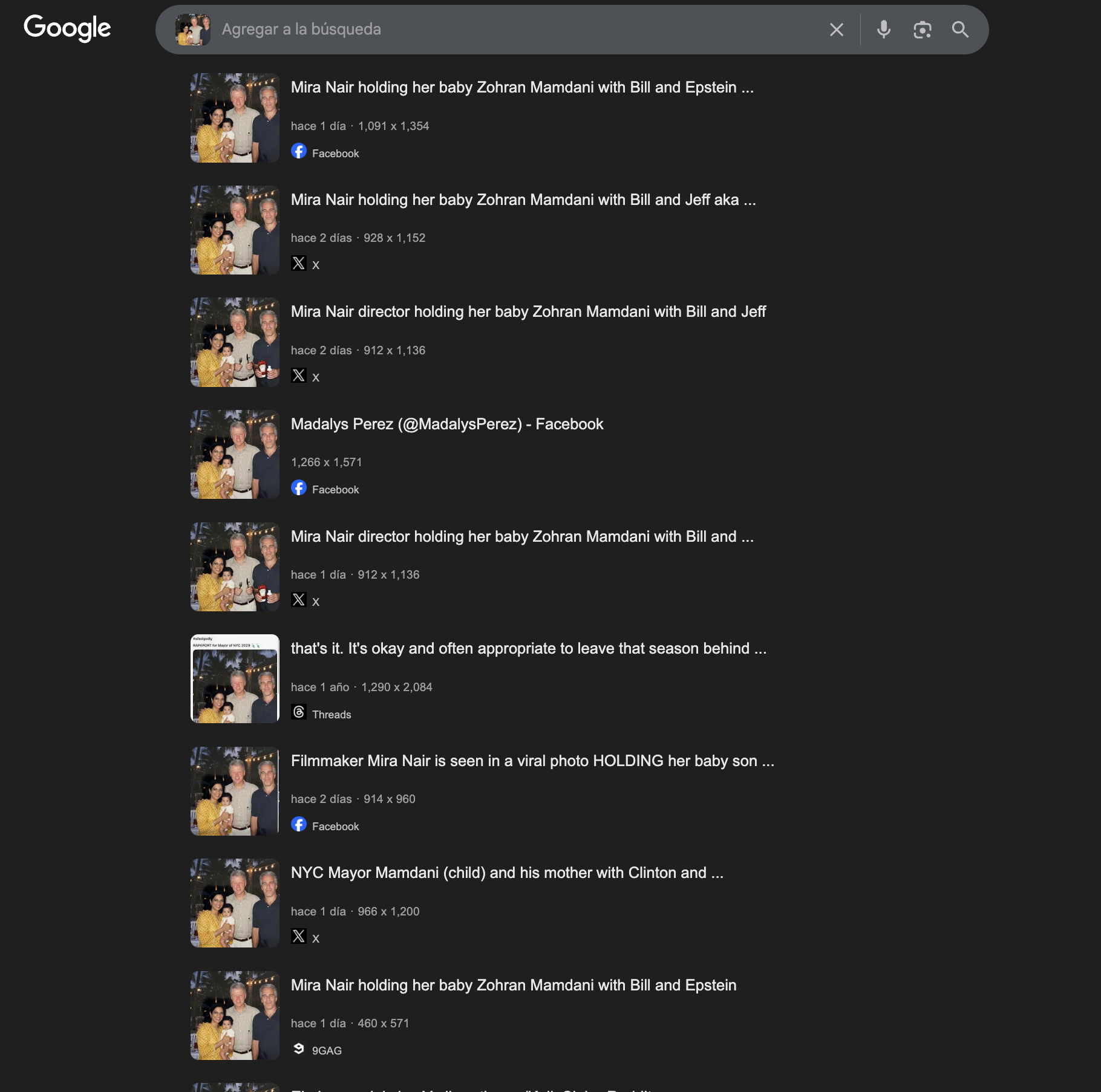 La segunda imagen que circula en redes supuestamente muestra a un Mamdani bebé en brazos de su madre a la par de Epstein y el expresidente Clinton. Sin embargo, si la foto hubiese sido tomada durante el evento de 2009, Mamdani habría tenido 18 años de edad ya que nació el 18 de octubre de 1991.