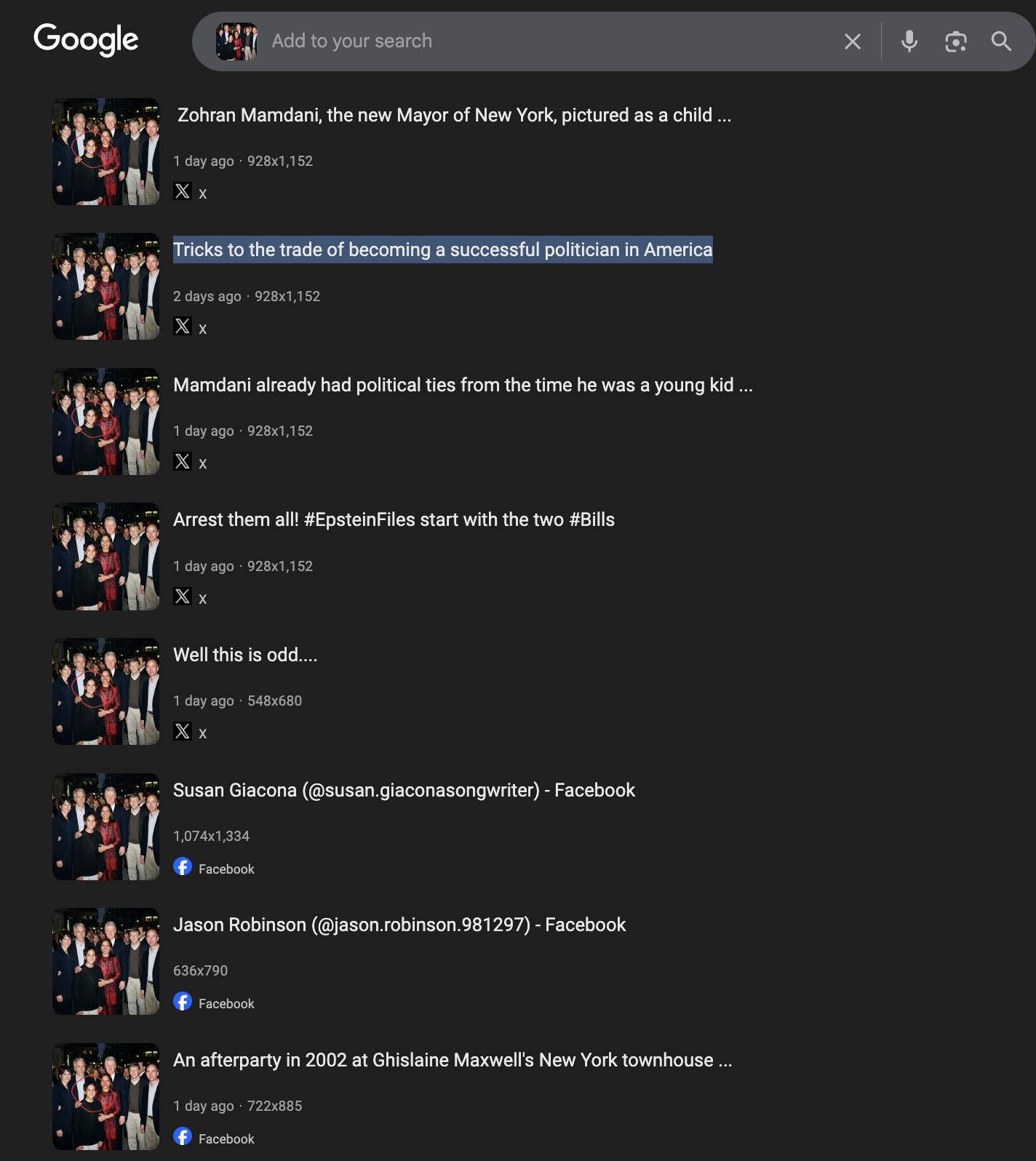 Circula en X (antes Twitter) y Facebook una imagen que supuestamente muestra a Zohran Mamdani, alcalde de la Ciudad de Nueva York, y a su mamá, la directora de cine, Mira Nair, junto al expresidente Bill Clinton, Bill Gates, Jeff Bezos, Jeffrey Epstein y Ghislaine Maxwell.