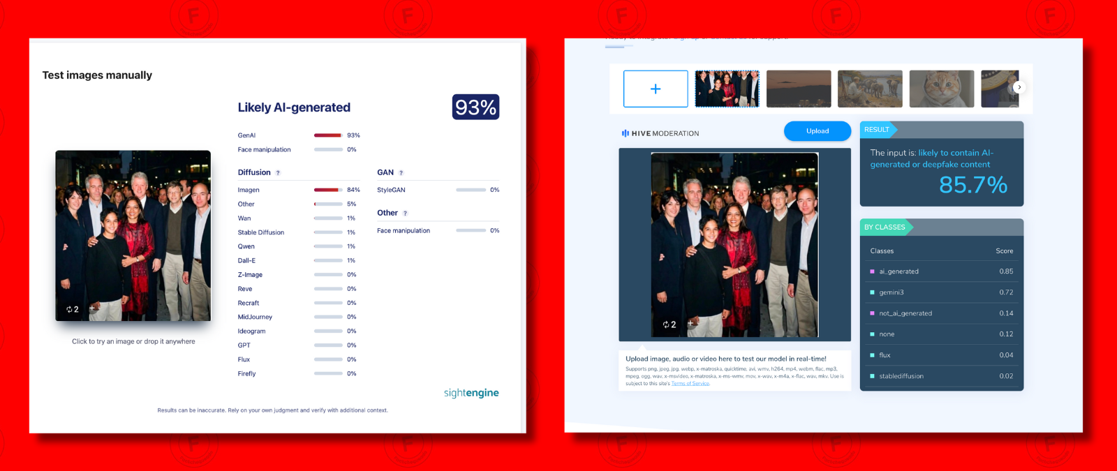 Hicimos análisis de la imagen en las aplicaciones Sight Engine y Hive Moderation, ambas herramientas de detección de contenido IA. La primera detectó un 93% de probabilidades de que la imagen fue creada con IA y la segunda un 85.7%.