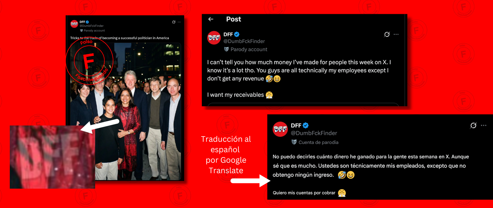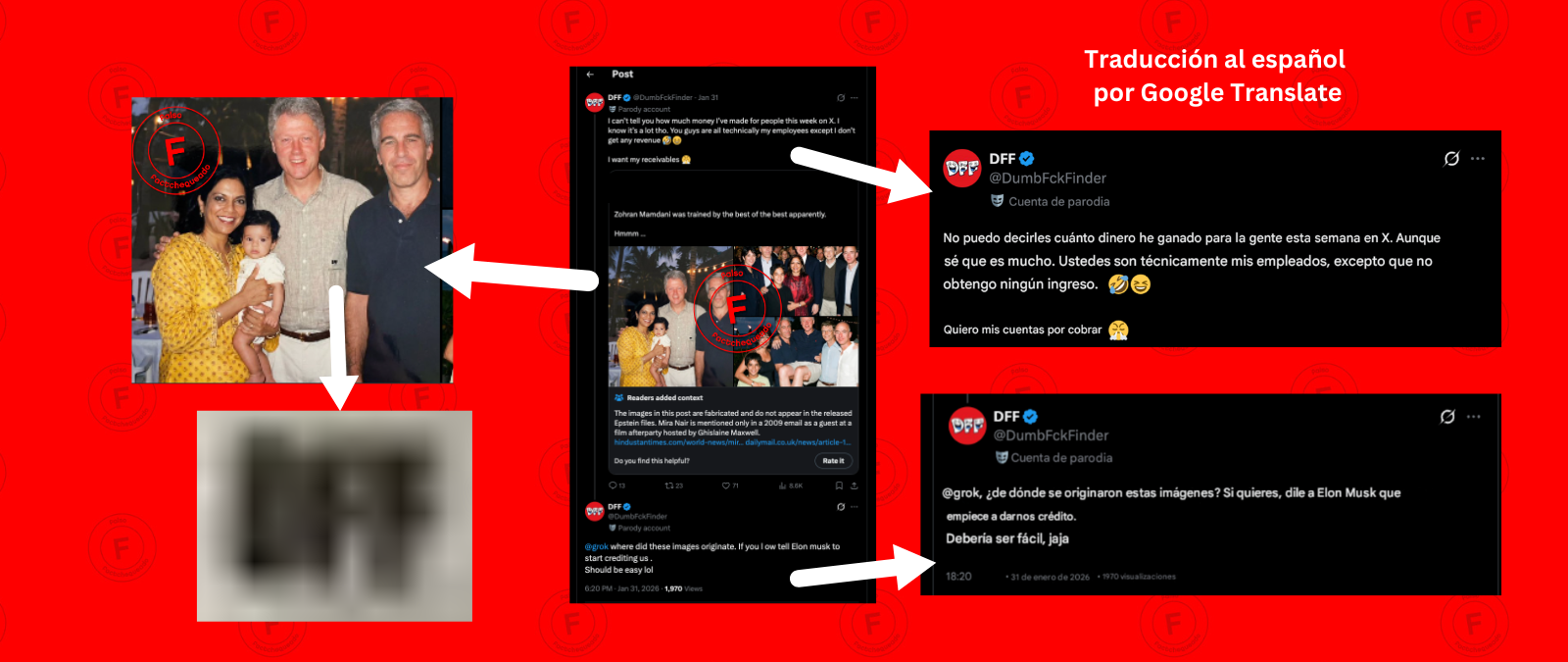 La imagen tiene las iniciales DFF en el bolsillo de la camisa de Clinton. Mediante una búsqueda inversa en Google Lens encontramos que la publicación más antigua de esta imagen se dio a las 8:04 a.m. ET del 31 de enero de 2026 en la cuenta de “@DumbFckFinder” y en distintos posts afirma ser el autor.