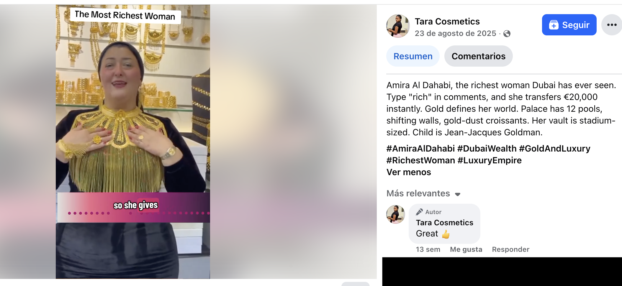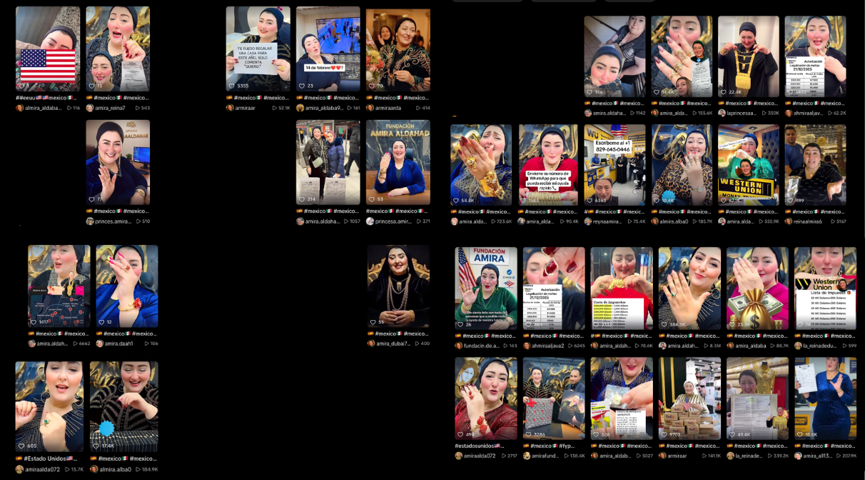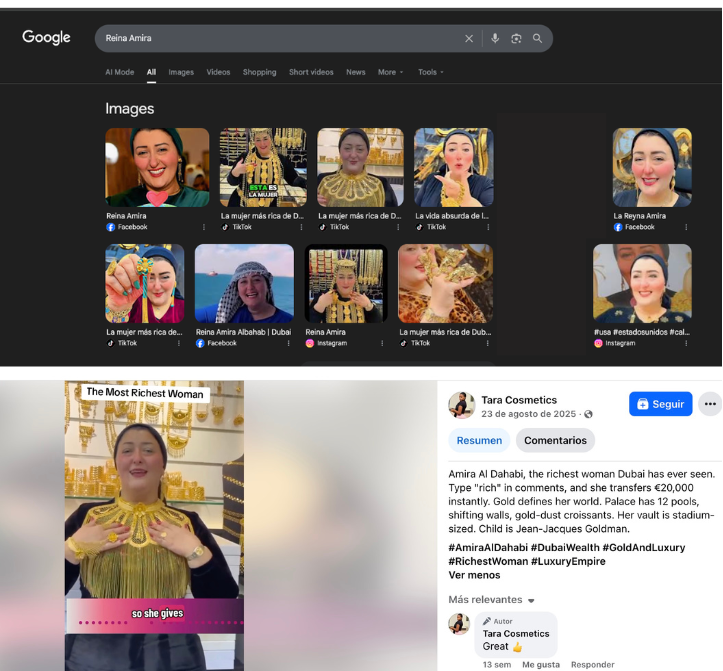 Por ejemplo, este video publicado el 3 de febrero de 2026, tiene una voz superpuesta que dice “las ayudas que está entregando la señora Amira desde Dubai son totalmente ciertas”. En este otro se ve a una mujer parecida a Amira felicitando en español a sus seguidores por haber recibido la supuesta “ayuda”.