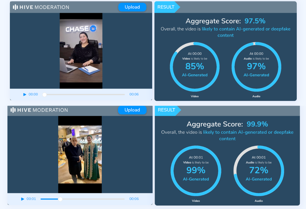 El análisis de dos de los videos que muestran a la empresaria hablando en español mientras promete un premio indican que tanto el video como el audio fueron creados con IA.