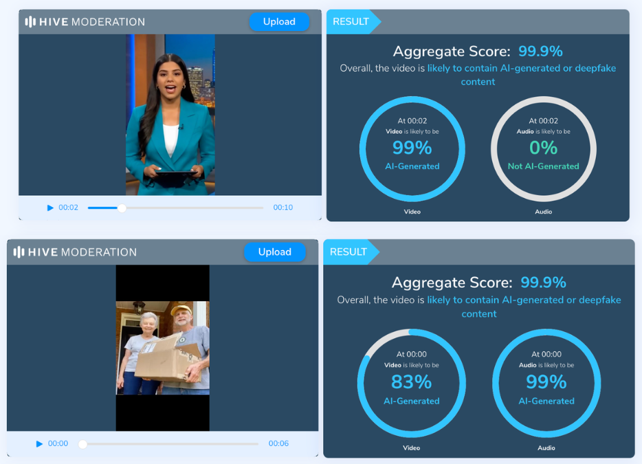 Asimismo, algunas de estas cuentas publicaron videos creados con IA de otras personas que no pudimos identificar. Por ejemplo, este video en TikTok muestra a una mujer con traje azul y un micrófono que aparenta ser una reportera supuestamente anunciando que Amira abrió una fundación en Estados Unidos. Este otro en Facebook muestra una pareja de adultos mayores cargando una caja y agradeciendo a “Amira” por una supuesta ayuda recibida. Ambos videos fueron creados con IA, según análisis en Hive Moderation.