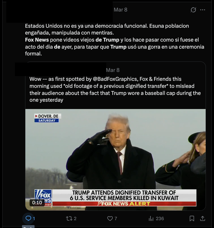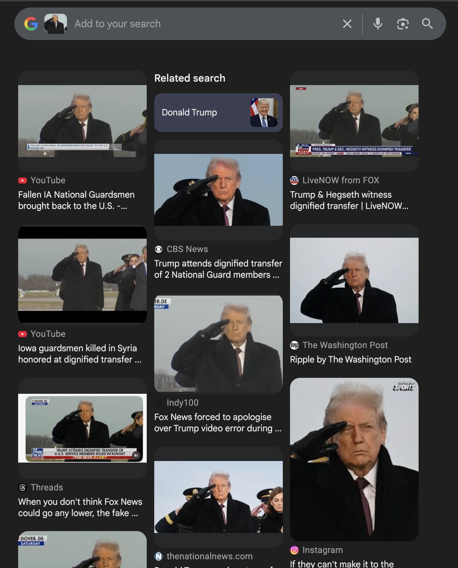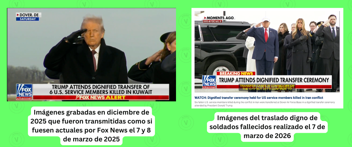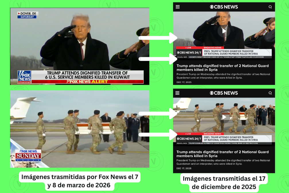 En ambas transmisiones, la cadena informó sobre el traslado digno de los 6 soldados fallecidos realizado el 7 de marzo de 2026, pero no reveló que las imágenes del presidente, en realidad, correspondían al traslado digno de dos soldados estadounidenses fallecidos en Siria llevado a cabo el 17 de diciembre de 2025, según pudimos precisar mediante una búsqueda inversa en Google Lens.