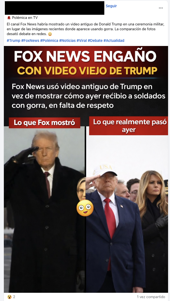 Las imágenes fueron transmitidas por la cadena de televisión como si fueran actuales, según los contenidos que circulan en redes, y muestran al presidente vistiendo un traje negro y corbata café, pero en realidad son de diciembre de 2025. En cambio, las imágenes recientes del presidente recibiendo a los soldados fallecidos en marzo de 2026 lo muestran vistiendo un traje color negro, una corbata roja y una gorra blanca con las iniciales “USA”.
