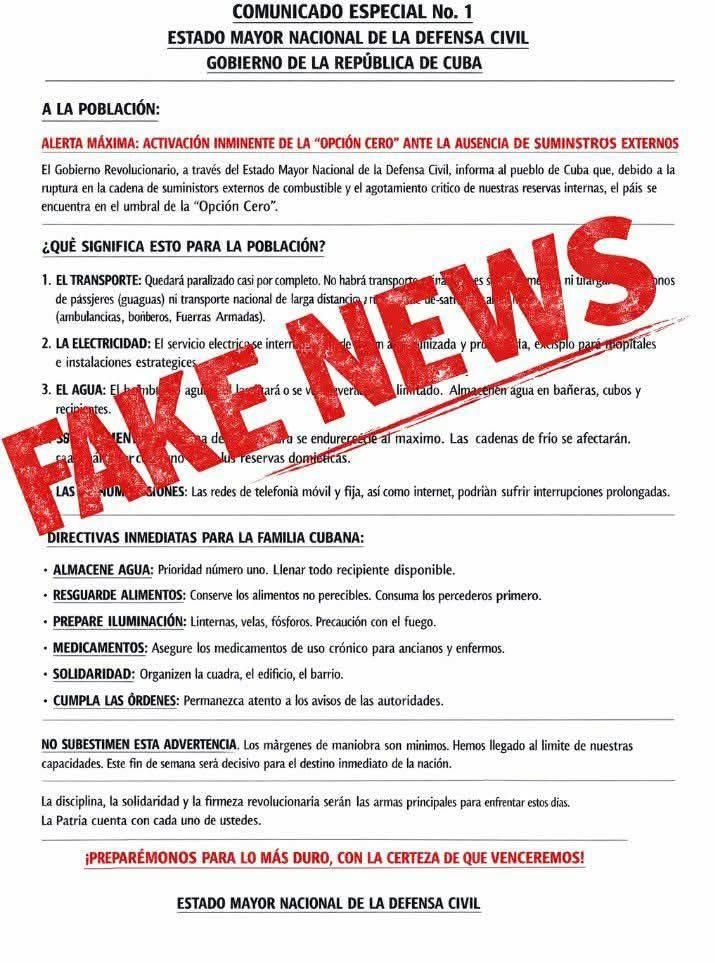 El Gobierno de Cuba no ha emitido este “comunicado especial” donde anuncia la activación de la “opción cero”, o el “estado de preparación total”, que paraliza servicios básicos, ante la ausencia de suministros externos. El Ministerio del Interior de la República de Cuba publicó en sus redes sociales que el supuesto comunicado que se comparte es “totalmente falso”. Además, no se encontró ningún comunicado al respecto en la web del Gobierno de Cuba. El Gobierno de La Habana también publicó en sus redes sociales sobre este supuesto comunicado que se trata de “fake news”.