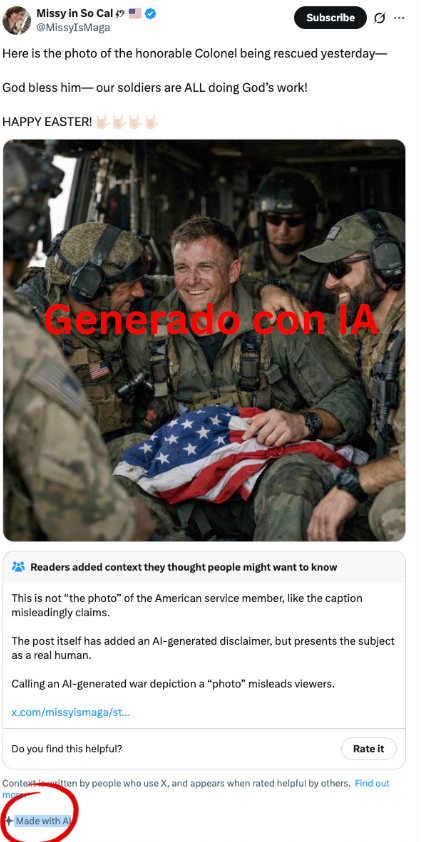 El gobernador de Texas, el republicano Greg Abbott, reposteó el 5 de abril de 2026 en su cuenta de X (antes Twitter) una imagen que supuestamente muestra al piloto estadounidense que fue rescatado ese día en Irán luego de que su avión fuera derribado en la madrugada del 3 de abril de 2026. Pero hay un problema: la imagen no es una foto real del piloto rescatado, sino que fue generada con inteligencia artificial (IA).